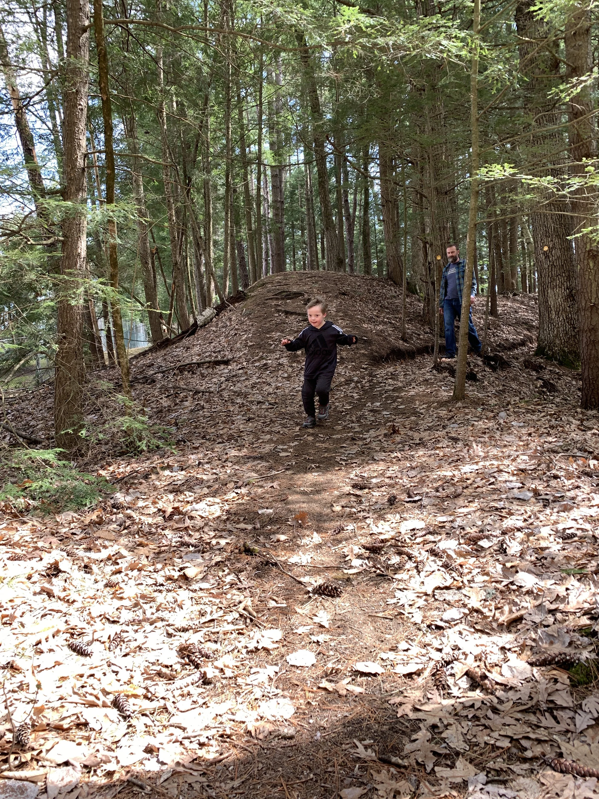 This property offers a nice wooded trail that is one to two-person width, hard-packed earth, gentle ups and downs with a few longer climbs. There are two bridges that cross Clendon Brook, and a few spots to splash in on a hot day.